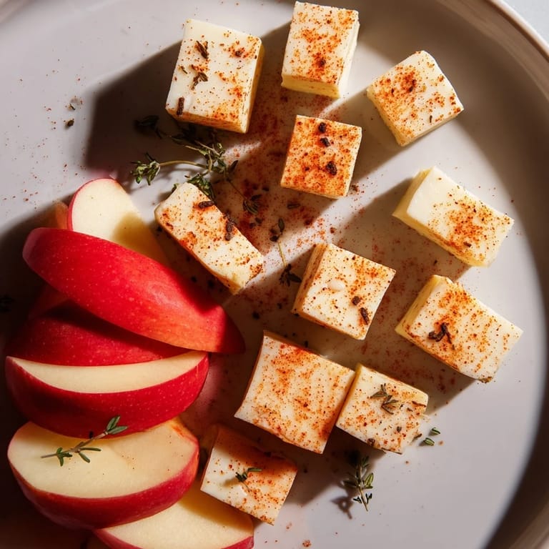 - Toss your apple wedges with a squeeze of lemon juice (this prevents browning and adds brightness), then fan them around and between the cheese cubes. The contrast between white flesh, red skin, and golden cheese is the whole visual story.