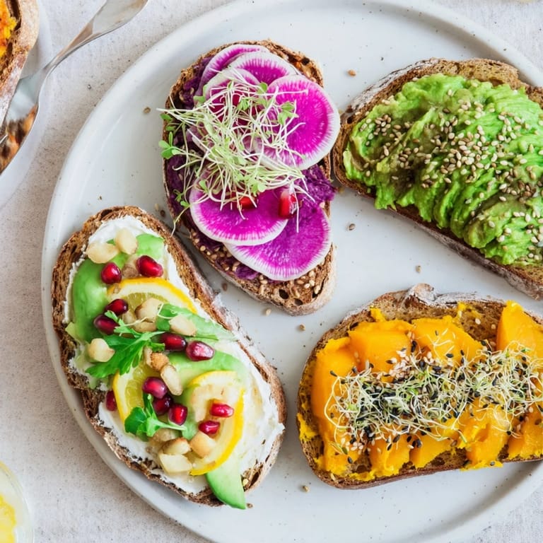Pin it Vibrant, flavorful breakfast toasts featuring colorful toppings like ube spread, avocado, and fresh garnishes for a lively start to your day.