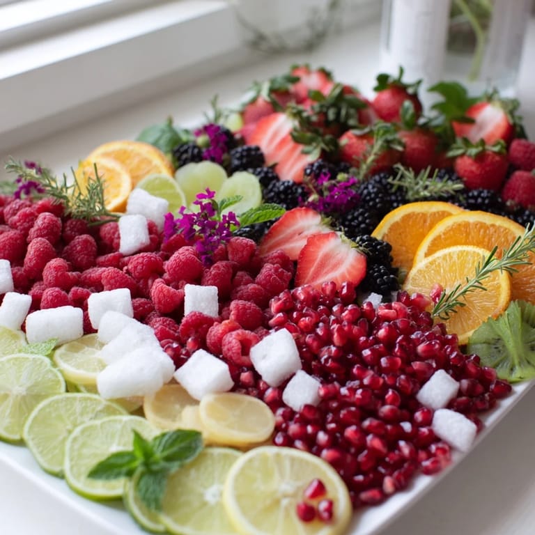 - Fresh Fruits: 1 cup fresh raspberries 1 cup fresh blackberries 1 cup fresh strawberries hulled and halved 1 cup pomegranate arils 2 lemons thinly sliced into rounds 2 limes thinly sliced into rounds 1 orange thinly sliced into half-moons 1 cup seedless green grapes halved