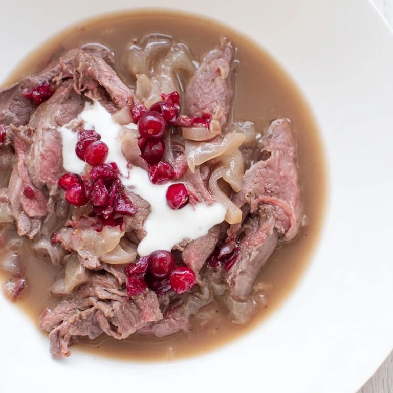 I made this for a dinner party once, convinced the reindeer meat would be hard to find, but I tracked down a source at a specialty butcher and felt oddly proud stirring that pot, watching the sour cream melt into the mahogany-colored broth. My friends circled back for seconds without asking, which told me everything I needed to know about whether this recipe worked.