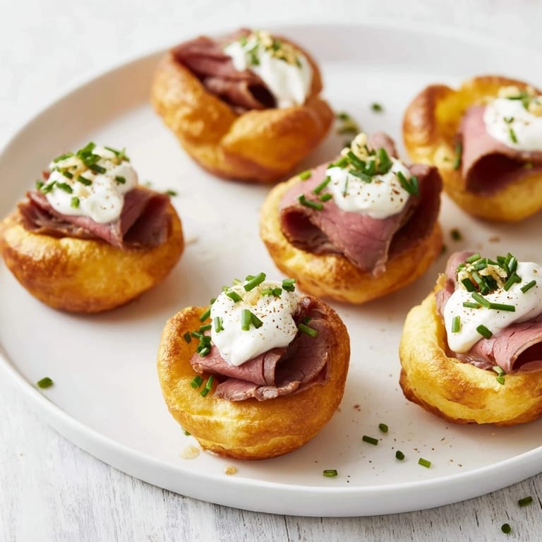 Pin it Delightful mini Yorkshire puddings, golden and crisp, filled with savory roast beef and creamy horseradish โ perfect for festive entertaining or as an elegant appetizer.
