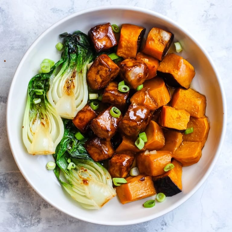 Pin it A vibrant, umami-packed plant-based main featuring caramelized tofu and roasted winter squash, topped with a savory miso glaze and served alongside tender bok choy.