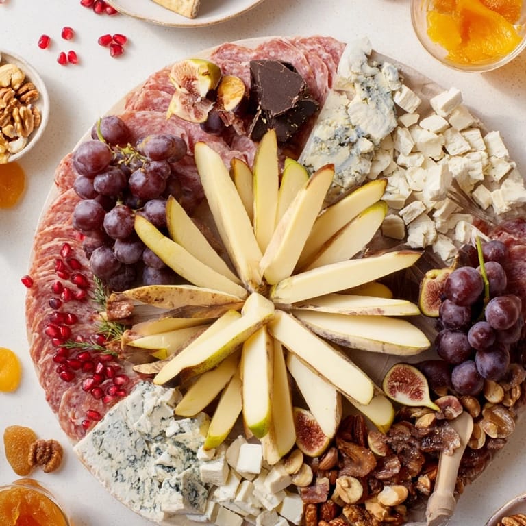 Pin it A festive and dazzling Christmas charcuterie board featuring a selection of artisan cheeses, cured meats, fresh fruits, nuts, and sweet treats, arranged in a starburst pattern to delight guests at any holiday gathering.
