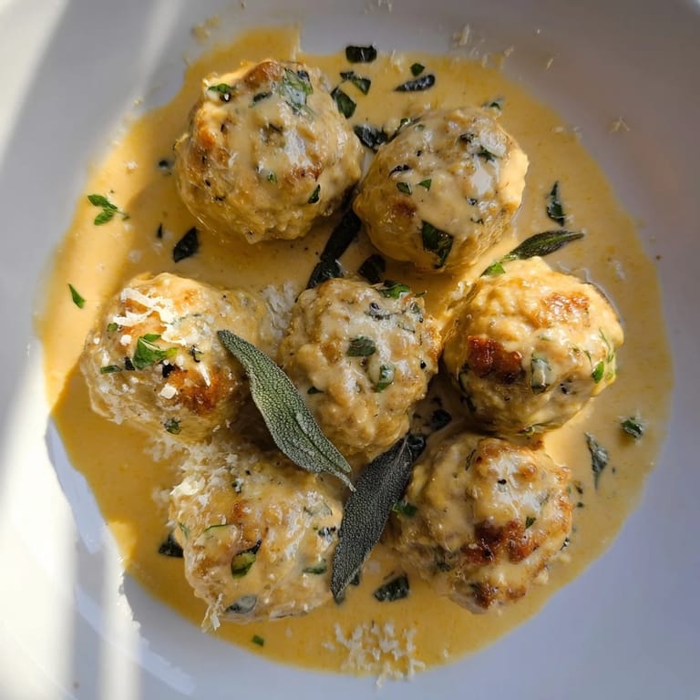 Pin it Tender turkey meatballs paired with a creamy, aromatic pumpkin sage sauce—perfect for a comforting autumn dinner.